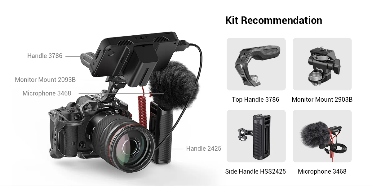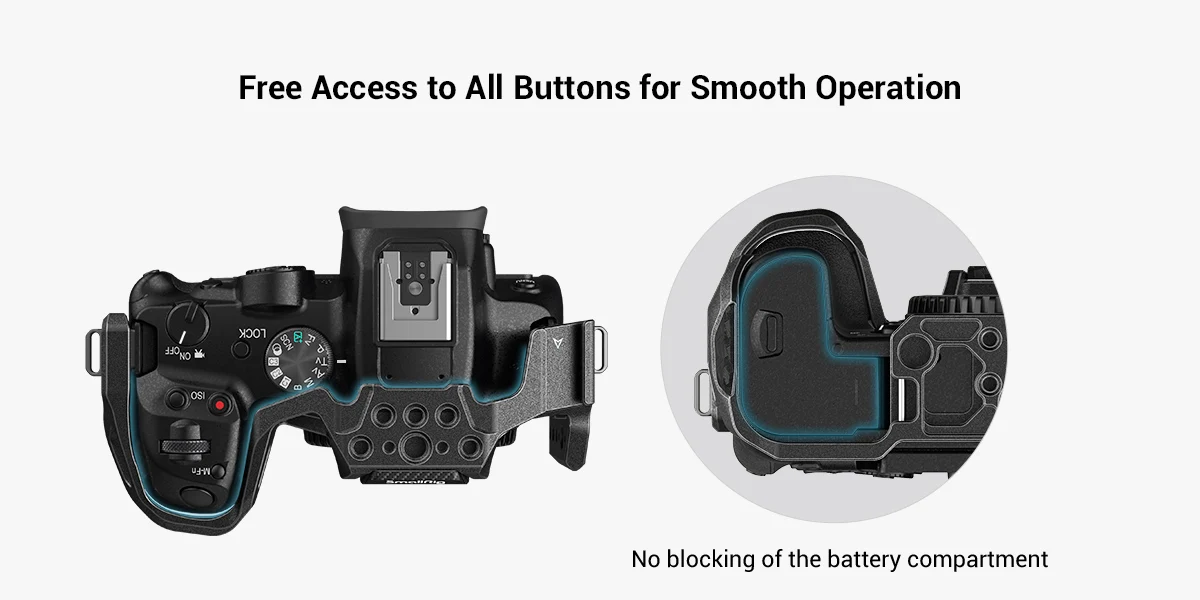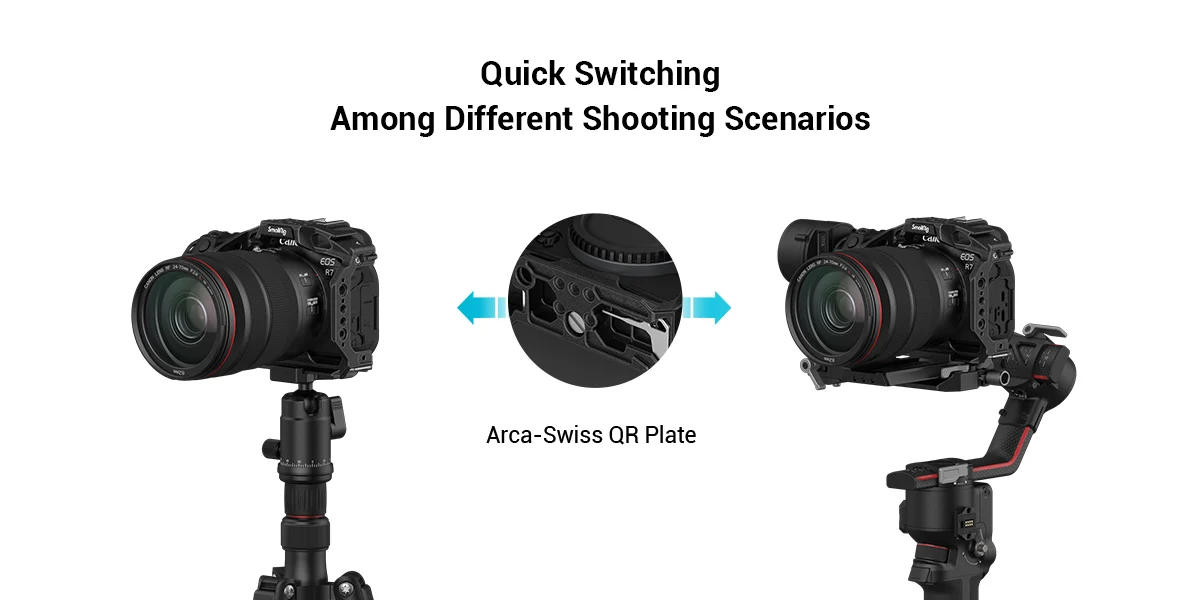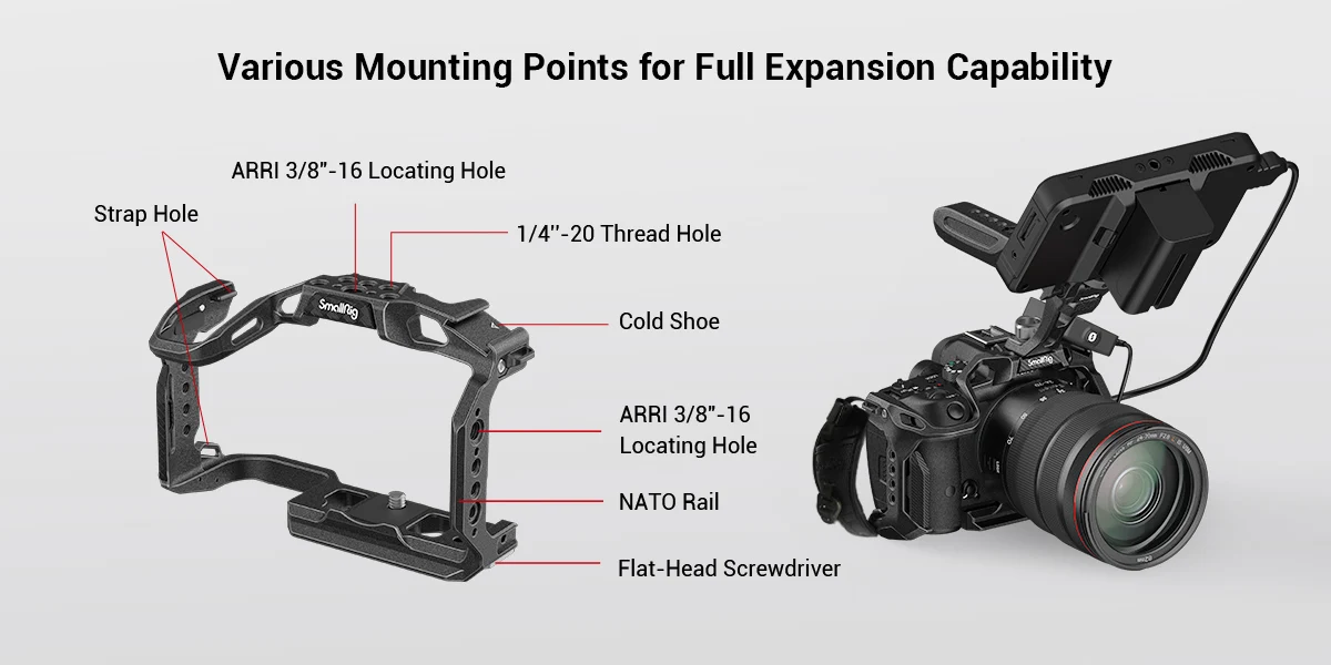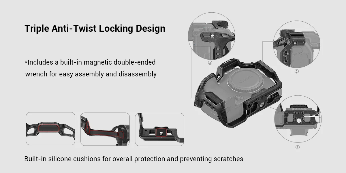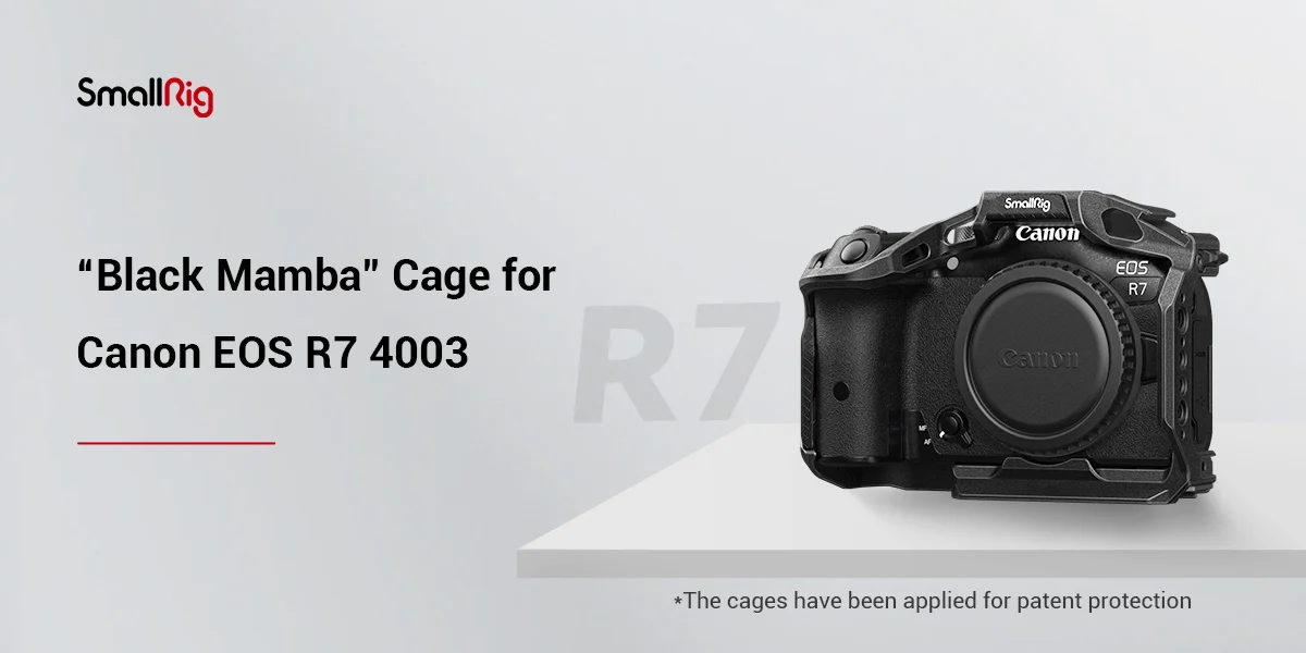 SmallRig ''Black Mamba'' Cage for Canon EOS R7 4003 is designed to provide protection and multiple accessory mounting points. Locking the camera via one 1/4 ''-20 screw at the bottom and one side lock adapter on both sides, this cage features silicone cushions that prevent scratching and ''Black Mamba'' style as a whole that gives full access to all controls of the camera. It also comes with 1/4 ''-20 threaded holes and ARRI 3/8'' -16 locating holes for and , and , , , Holder for Portable , , etc.; Cold shoe mounts for attaching the microphone and LED light; NATO rails for and ; and strap slots for and Camera Shoulder . Arca-Swiss quick release plate at the bottom supports DJI RS 2 / RSC 2 stabilizer and Arca-Swiss tripod to allow quick switch among handheld, stabilizer, and tripod shooting scenes. The built-in QD socket on the bottom is available to attach the quick disconnect strap system. In addition, a double-ended wrench is included for easy disassembly.