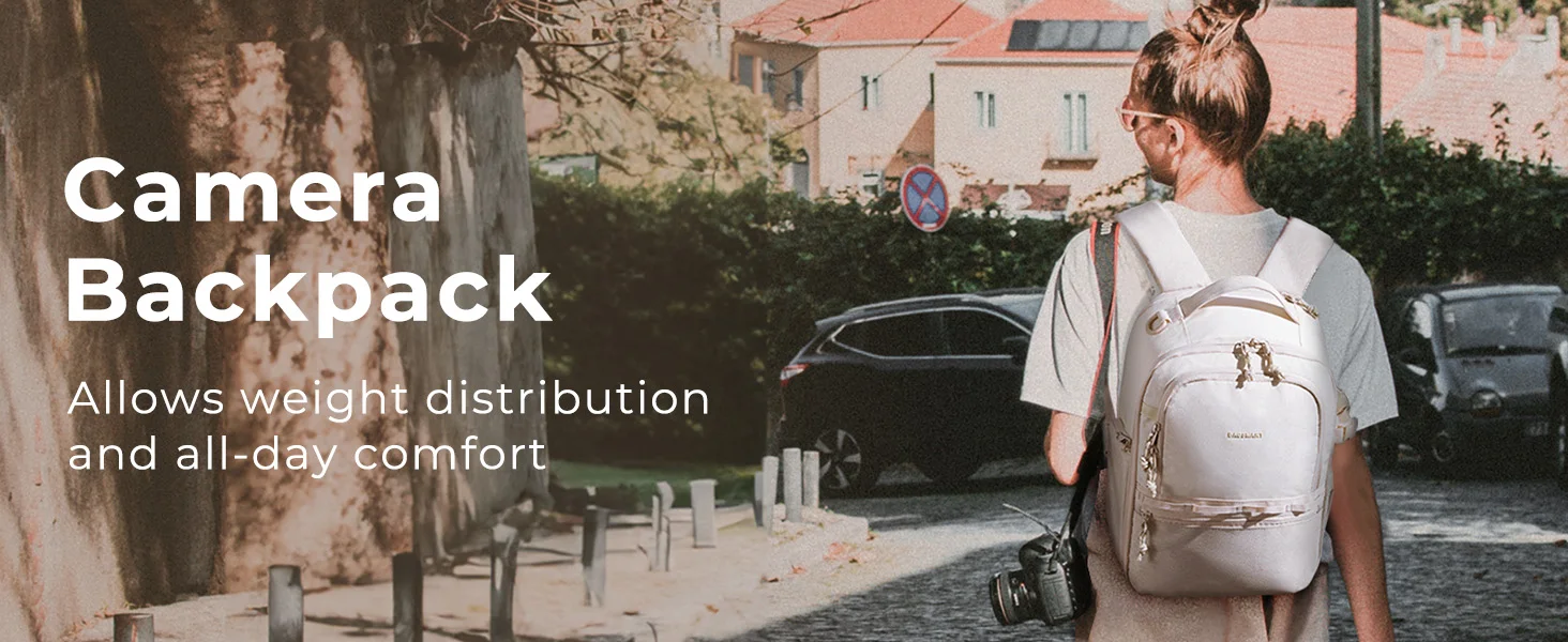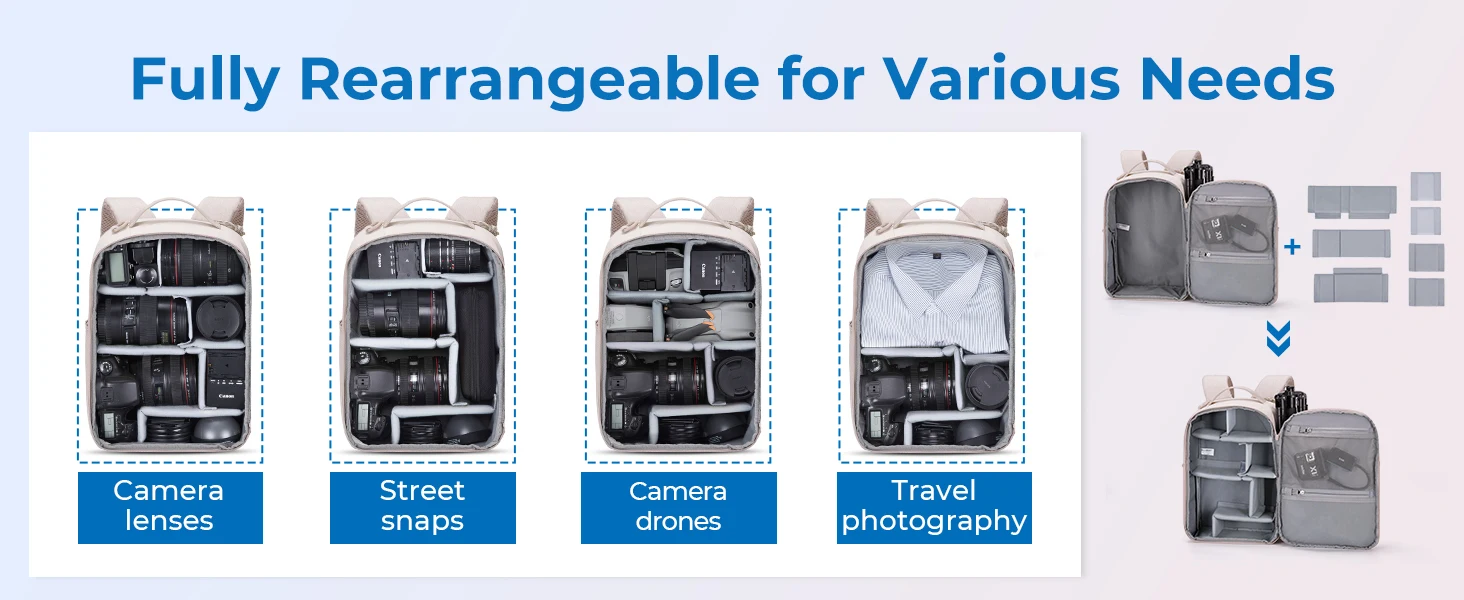 Versatile and Practical Design - This DSLR camera backpack comes with removable internal dividers that effectively separate and protect your precious camera equipment. You can easily customize the compartment to accommodate different camera sizes or remove the divider to turn the backpack into a multi-purpose travel bag or daily bag. The side openings of this backpack provide quick access to your gear, while the L-shaped front pockets are perfect for storing everyday essentials.