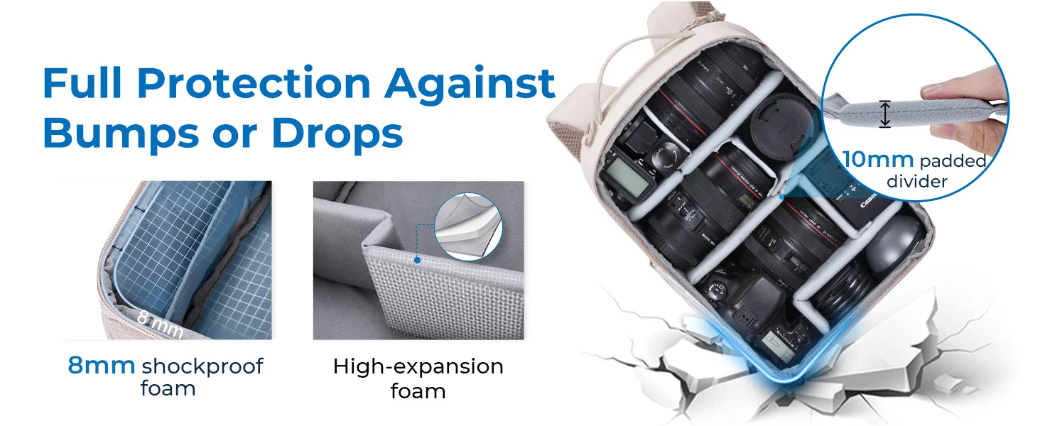Ultimate Camera Protection - Our anti-theft camera backpack is made from waterproof and scratch-resistant polyester fabric, with reinforced padding in the main compartment and a dedicated 12.9-inch tablet compartment. It provides excellent cushioning and protection for your camera, lens, flash, tripod and other accessories. With our camera bag, you can confidently explore and capture moments without worrying about damaging your valuable equipment.