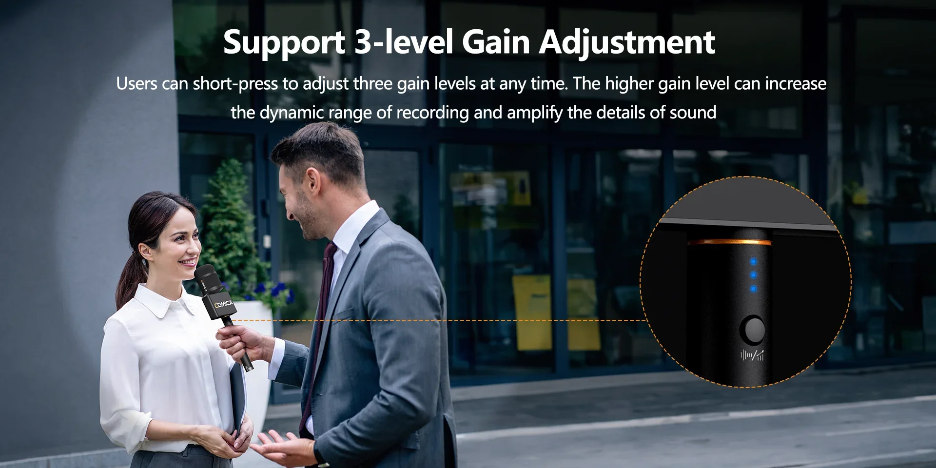 Users can short press to adjust three gain levels at any time. The higher gain level can increase the dynamic range of recordings and amplify the details of captured sounds.