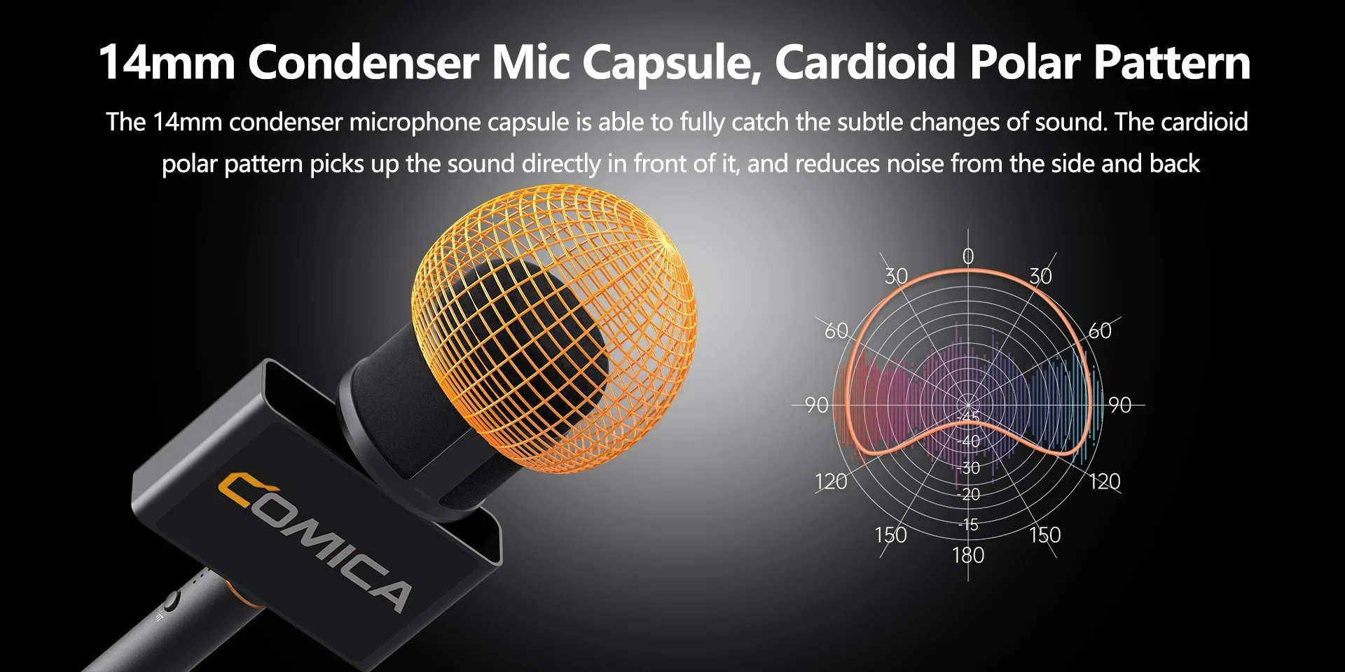 The 14mm condenser microphone capsule is able to fully catch the subtle changes of sound. The cardioid polar pattern picks up the sound directly in front of it, and reduces noise from the side and back.
