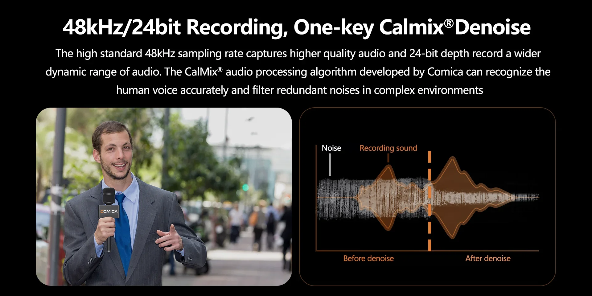 The high, standard 48 kHz sampling rate captures higher quality audio and the 24-bit depth records a wider dynamic range of audio than lesser 16-bit products. The CalMix audio processing algorithm developed by Comica can recognize the human voice accurately and filter redundant noises in complex environments.