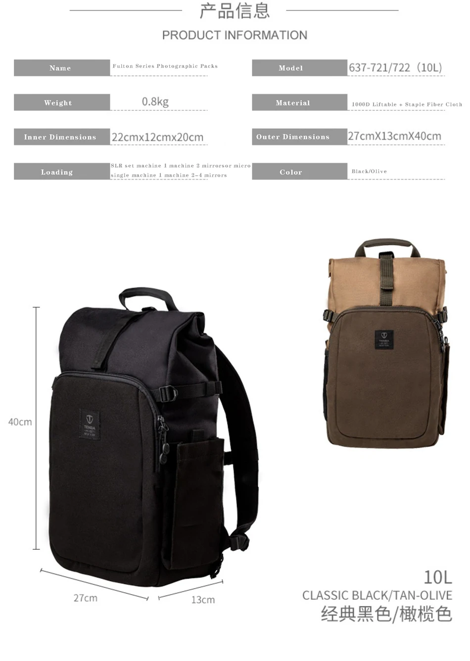 Tenba Camera Bag Casual Shoulder Camera Bag Professional Waterproof Outdoor Micro SLR Backpack Fulton V2